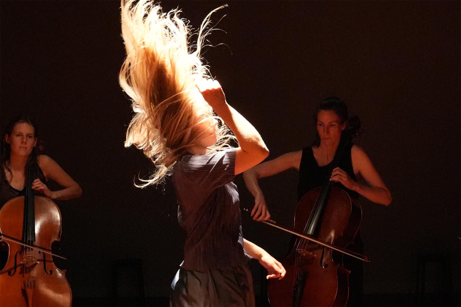 Elisabeth Hetherington schakelt moeiteloos over van stem naar beweging en combineert ze als onafhankelijke lagen. De cellisten bewegen zich in SONUS MOTUS even scherp en vanzelfsprekend in de samenvallende wereld van klank en lichaam.